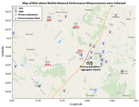 To validate the results obtained in [7] via RT-HIL setup, it is essential to get a realistic and accurate model of the cellular networks that reflect the true network behavior especially within the area having BDG (hereafter referred to as Benchmark Grid Area (BGA)). As KauNet has been opted in the RT-HIL setup as a RT network emulator that provides patterns based network emulation, the pattern files were captured from BGA using NetMap [28,29]. The NetMap patterns are useful as they provide realistic performance under realistic conditions from networks that are normally hard to obtain information from/about, and are relevant, e.g., for operators to assess their possibility to provide connectivity service to control systems. Figure 7 shows the map of BGA where the pattern files were collected. The map also shows Google map based locations of all ReGen plants in BDG along with the location of communication masts surrounding the area. Thus, the NetMap pattern files reflect the current nature of the access network in the relevant area.