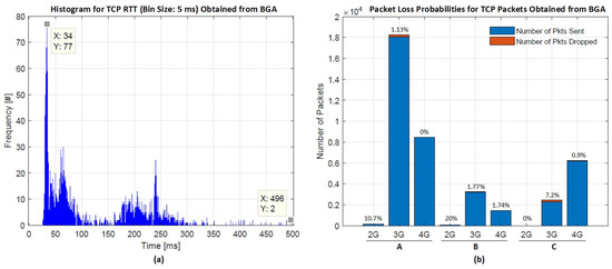 Figure 8a shows the combined histogram of RT-RTT measurements, while Figure 8b shows the packet loss probabilities captured from BGA using several devices. It is important to note that the measurements shown in Figure 8 have been obtained over a period of 1.5 years with varying number of end devices. In Figure 8a, it can be observed that, for majority of the cases, RTT lies around 30 ms approximately. This means that for a transfer of information update, a minimum of 15 ms delay (half of RTT—assuming the same route for request and reply to/from the server) can be expected for the maximum times in daily operations. However, as this network is heterogeneous (and shared by many users), the delay continuously varies depending on the network conditions and number of users using the network. The worst case for end-to-end delay is observed as high as 500 ms (RTT) (see Figure 8a). Further, Figure 8b shows a varying number of packets sent along with the number of drop packets via different ISPs based on 2G, 3G and 4G technologies. Here, the number of packets sent through a particular technology depends on its available service within the BGA. 2G has the minimum number of sent packets because of its limited service available around BGA. However, according to Figure 8b, the packet losses observed while capturing these measurements were observed as high as 20% for 2G and as low as 0% in 4G technology.
