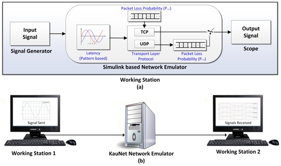 Setup 1—Non-RT Model. In this setup, the non-RT network simulator is used between a signal generator and the receiver (scope) to send signals under different selected network parameters, i.e., varying end-to-end delays and packet loss rates. The three components (i.e., signal generator, network emulator and a scope to capture output) reside in the same workstation in MATLAB/Simulink, as shown in Figure 9a.