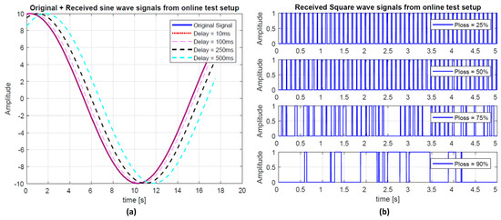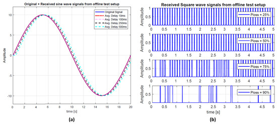 Non-RT Setup—Test Results. Figure 11a shows the original sine signal compared to the ones received from network emulator under four delay based test cases. It can be observed how a signal can be affected due to different (average) delays in a network. It can be noticed that all received sine waves are steady state waveforms. This is because of a very high sampling rate selected (i.e., 1 ms). However, if the sampling rate is reduced, this will influence the shape of the incoming signal with each added average delay patterns. Figure 11b shows the received square wave signals from network emulator under increasing packet loss rates in a network. It can be observed how a signal is affected with increased packet loss rates.