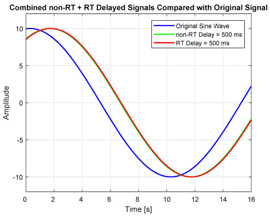 Original sine wave signal compared with delayed signals received from non-RT and RT test setups with MSE of .