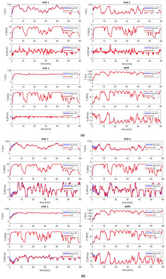 Figure 14 shows, for each ReGen plant in the BDG, the active power (P), reactive power (Q) and voltage (V) profile both for non-RT simulation and RT communication setup throughout the considered time-frame of 1 h according to the specified test cases. It can be observed in Figure 14 that no significant differences are observed for the specified test cases in the RT test setup as compared to the non-RT tests. However, since there is a little difference seen in the some results, it is worth calculating the percentage error in each case. The percentage error in case of V and P is calculated based on the difference between non-RT and RT results, keeping non-RT results as reference (see Equation (1)). The same applies for P, while, for Q, it can be observed that the signal includes zero, which will give infinitely large errors once divided by the reference signal (non-RT). Therefore, for Q, a delta signal () is plotted which is the difference between the Q obtained by both the setups i.e., non-RT and RT (see Equation (2)). The results based on Equations (1) and (2) are shown in Figure 15.