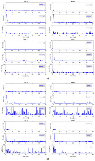 Error in V, P and Q of PVP 1, PVP 2, PVP 3 and WPP sent via non-RT and RT communication models over one hour with: (a) 10 s update rate; and (b) 1 min update rate.