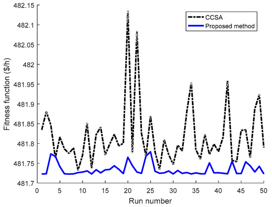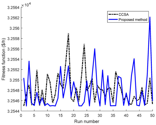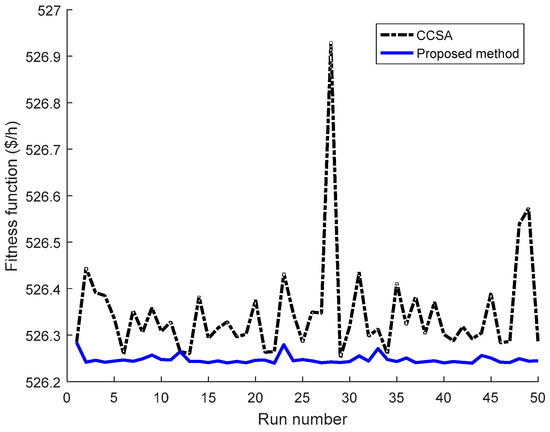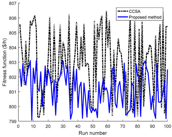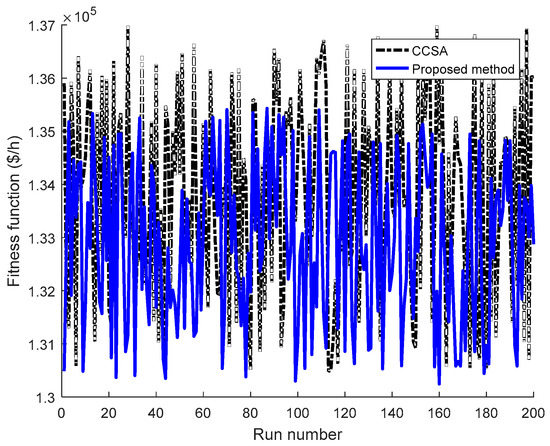 Figure 10 illustrates the search ability superiority of the proposed method over CCSA for 100 considered runs. It is clear that the proposed method can find a higher number of good optimal solutions and a fewer number of bad optimal solutions than CCSA because the number of blue points of the proposed method, which is below the number of black points of CCSA, are higher while the number of black points of CCSA, which is more than the blue points, are higher. Thus, the proposed method is more powerful and stronger than CCSA for searching optimal solutions.