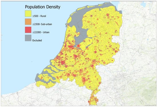 Map division in urban, suburban and rural areas in the Netherlands based on population density.