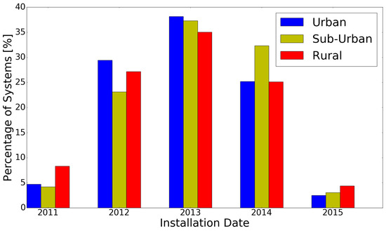 All the PV systems of the data set were divided in three categories based on the population density of the location that they were installed. This separation resulted in 1166 systems located in urban areas, 981 in suburban areas and 1119 in rural areas. With the sample almost evenly distributed between the three different types of regions, the installation date is the first parameter that was examined. Long-term outdoor exposure and operation of the modules might lead to performance decay [26], which could affect our final results. However, the distribution of the installation year, which is depicted in Figure 2 as a percentage of the total number of systems in each group, confirms that most of the modules on Dutch rooftops are relatively new. As it can be clearly seen, the majority of the systems were installed between 2012 and 2014, a time period which is not long enough for a commercial module to exhibit any form of degradation effect [27].