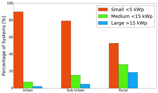 The characteristic that is affected the most from the geographical location is the average system size. Scarcity of available space is probably one of the most representative features of urban areas and unavoidably solar installations could not be an exception. While in cities the average rooftop hosts a 3.4 kWp system, in sub-urban locations, this capacity increases to 4.7 kWp, and, in rural areas, it almost doubles that figure reaching 9.2 kWp. The effects of urban compactness are illustrated in Figure 3 where 90% of installations placed in cities are smaller than 5 kWp and only 2% has a capacity higher than 15 kWp. The lower population density of rural areas results in higher availability of space, which can be better utilized by allowing room for installation of larger PV generators. Small size systems are still dominant in rural areas as 5 kWp are sufficient for the average household; however, large systems reach 19% of the total number of installations. This number accounts for the 54.3% of the total installed capacity in rural locations.