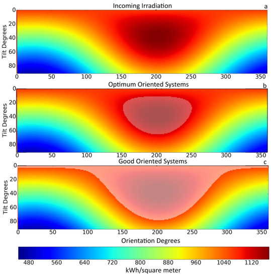 (a) Plane of Array (POA) irradiation; (b) optimum oriented systems; (c) well oriented systems.