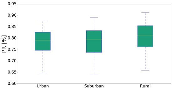 To determine whether there is a variation in performance between PV generators located in urban, suburban and rural areas, the dataset of 2016 is presented as a boxplot in Figure 5. Comparison of values can reveal losses caused by wiring, system failures, Alternating Current/Direct Current (AC/DC) conversion and dust, which are mainly system dependent, but it can also unveil a situation were a system is shaded for a long period of time or it is exposed to higher temperatures. To further investigate if the means of the three groups demonstrate significant statistical difference, one way Analysis of Variance (ANOVA) was performed, which is a common practice to identify differences in PV monitoring [31]. The null hypothesis was set so that the three distributions had no difference in the mean values.