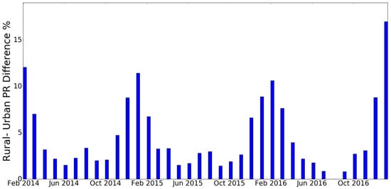 To further identify the causes of this performance mismatch in the annual mean values, it is necessary to investigate whether the difference is leveled throughout the year, or it is subjected to a seasonal variation. For that purpose, the monthly value differences between rural and urban systems will be compared. As it is shown in Figure 6, there is a specific pattern that the percentage difference between the monthly values follows consistently for the entire period of monitoring. During winter months (December–February), PV generators that are located in rural areas are outperforming the ones located in urban areas by up to 16% in some cases. The difference gradually declines during spring and summer months where it reaches a minimum of 0.2–3.4%.
