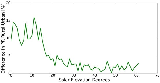 The seasonality and the consistency of the effect can be attributed only to variations in environmental parameters. Since the highest difference is observed during winter months, additional focus will be set on irradiation conditions, and specifically the trajectory of the sun. For the geographical coordinates of the Netherlands (Amsterdam 52.3702° N, 4.8952° E), the maximum solar elevation is limited to 15° in December and 20° in January, but it can reach 61° in June. In order to examine the effect of the solar elevation on PV performance, is correlated to solar elevation degrees (Figure 7) using the PVLIB library of Python [32] and the specific coordinates of every installation. As it is observed, for low elevation angles below 18°, the difference in values can reach 15% in favor of rural systems. While low solar paths are in general not favorable for the energy yield of PV installations regardless their specific location, it appears that it has a stronger effect on the ones located in urban areas. A possible explanation is that low solar elevation is more likely to cause shading in the dense environment of a city rather than in a sparsely occupied rural area. To consider the overall effect on the energy production on a yearly basis, it is highlighted that, during late autumn and winter months (November–February), which corresponds to 1/3 of a year, the sun spends 79% of its time in the sky below the threshold of 18°. However, besides this behavior that is observed for a part of the day or the year, a systematic difference that can reach 5% in favor of rural systems is noticed for the rest of the time and therefore a more detailed analysis is conducted over specific urban indicators.