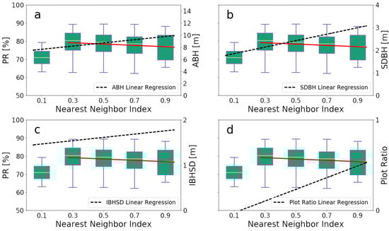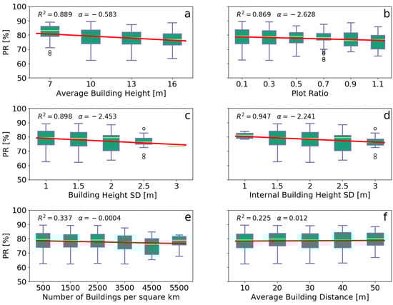 As it can be seen in Figure 9, the average is affected only for small NNI values (0–0.2), where urban clustering is high. One would expect that, as the NNI value increases and the horizontal distribution of buildings in an area leans towards scattering, the overall performance of PV systems would increase. However, by considering NNI values above 0.2, an almost negative linear relationship appears (, ) compared to the average , which is depicted as a red line in Figure 9a–d. This counterintuitive outcome can be explained by taking into consideration the ABH, the SDBH, the IBHSD and the Plot Ratio of those areas. All four indicators exhibit strong, increasing, linear trends (black dashed line in Figure 9a–d) for those specific locations (, , , ), proving that even in the case of high clustering, vertical distribution still plays the major role.
