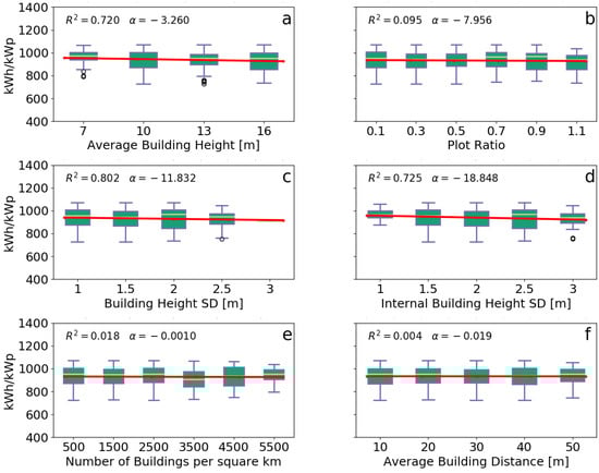 In this case, the six different indicators that were described in Section 2 are compared with the values of the systems as they all detach the form of the cityscape from the population factor (Figure 8). All the PV installations were grouped according to the overall characteristics of their surrounding location as this was indicated using GIS software. The groups of ABH, Plot Ratio, BHSD and the IBHSD predict the average with a linear regression model (with slope ) and the high R-squared values show a good correlation within the boundaries of the independent variables. The reasons behind the low R-squared values of the last two indicators, the Number of Buildings and the ABD, will be further examined.