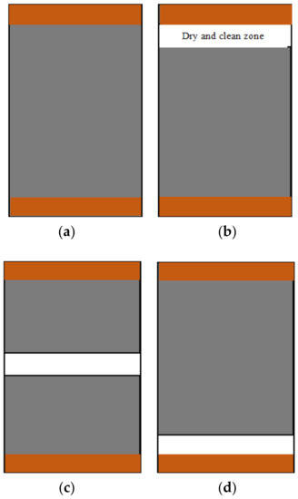 Sample configurations: (a) uniform pollution layer; (b) dry band near HV electrode (c) dry band near the middle region (d) dry band near ground electrode (e) Dry bands near high voltage and ground electrode (f) Dry bands near middle region, high voltage and ground electrode.
