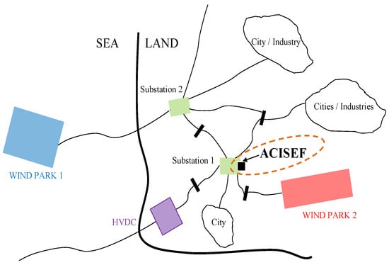 Thus, the proposed contribution of this article arises from a real necessity in a specific AC grid. Due to confidential concerns, it is not possible to provide too many specific details about this context. However, the details are not necessary to understand the main conceptual issues. The most important elements of the grid are depicted in Figure 1. It is possible to distinguish two medium-scale wind farms closely connected, together with a thyristor-based HVDC system. There are also some towns and industrial loads in the neighborhood. The combination of all of these elements interacting together produces in some periods of time (depending on the available generation, load consumption, etc.) a deterioration of the quality of the AC grid voltage due to the presence of low-order voltage harmonics (predominantly 11th and 13th orders in the validation scenario of this article, among others) of unusually high amplitude levels, leading to undesirable problems at the elements connected to the AC grid. This unacceptable situation can be solved by the inclusion of active filters (by means of VSC converters) to mitigate the voltage harmonic of the grid [].