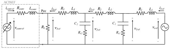 Finally, this section shows how the ACISEF is still effective with an output LC filter (providing better attenuation of the switching harmonics) and how the analytical global model can analyze it. Hence, if the output filter at the converter side is modified to an LC filter, as represented in Figure 18, the analytical model equations must be slightly modified. Note that Rt and Lt are the equivalent transformer’s impedances. For this particular illustrative example, the following numerical choices are made (high voltage side values): Rt = Rconv·(1/3), Lt = Lconv·(1/3), Rf = Rconv·(2/3), Lf = Lconv·(2/3), Rcf = 10 mΩ·(n_transformer)2, Cf = 1250 µF/(n_transformer)2.