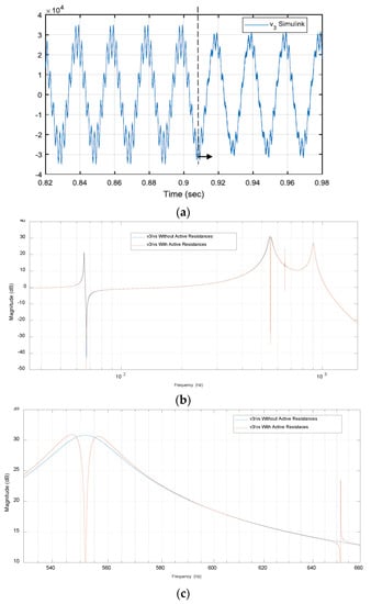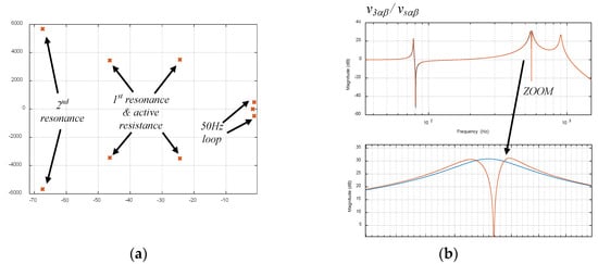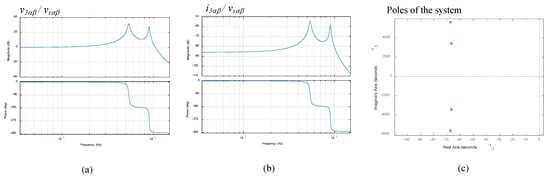In addition, Figure 4c shows the pole plot of the transfer function v3αβ(s)/vsαβ(s). It can be seen that there are two dominant complex conjugate pole pairs, with an imaginary part that corresponds to the resonant frequencies (in rad/s) and a real part that is associated with the amplitude. There is also a fifth real pole whose influence is not significant compared to the dominant ones. For simplicity, and as the real negative part is very far from the dominant poles, it is not shown in the plot. It must be highlighted that the rest of the variables of the system (i1αβ, i2αβ, v1αβ, v2αβ) present the same poles and therefore will result in very similar Bode diagrams with resonances located at same frequencies. Note that a fifth order system may not accurately represent frequencies higher than 1 kHz; however, for simplicity in the exposition this order is adopted in an attempt to avoid the necessity of working with a more complex system. It has to be highlighted that for the range of frequencies analyzed in this article, the fifth order system is accurate enough.