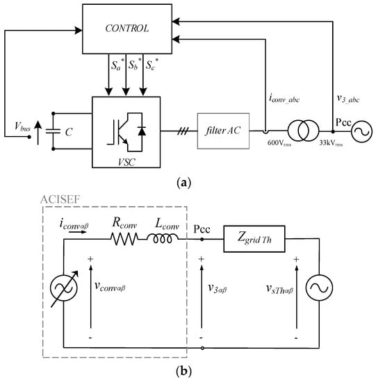 Then, connected to the AC grid at a point where the presence of undesired voltage harmonics was found, the converter providing active impedance at selective frequencies (ACISEF) is located. This point is called point of common coupling (Pcc). By neglecting the higher frequencies produced by the switching frequency (and multiple families) of the power electronic converter, it can be seen that the setup is modeled as an equivalent controlled voltage source (vconv) and a series impedance (Rconv-Lconv) mainly representing the converter’s harmonic filter impedance plus the equivalent impedance of transformer for connecting to the medium voltage AC grid (see Appendix A for data). By means of the proposed converter’s control, presented in subsequent sections, it will provide a vconv of 50 Hz (frequency of grid) added to the frequencies of harmonics that it is required to actively mitigate (550 Hz, 650 Hz, 750 Hz, etc.).