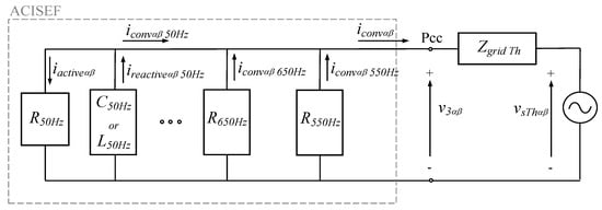 Therefore, by using the control strategy that in later paragraphs is explained the converter is able to behave as an active (or virtual) impedance at selective frequencies. As schematically represented in Figure 6, it is seen that the converter can provide impedance behavior at selected frequencies, such as for instance: R550Hz, R650Hz, and so on. Each selected impedance, by measuring the voltage at the Pcc (v3αβ), only reacts to its corresponding frequency, providing a current defined by the desired impedance itself. The selected active impedances can behave as pure resistive impedances, or as a combination of resistive and inductive (and/or capacitive) impedances (in series or in parallel).