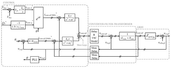In this case, ω and ω1 are respectively the angular frequencies of the grid and the voltage harmonic that is intended to be mitigated. Meanwhile, ki and ki1 are the integral gains of the resonant regulators. The switching harmonics due to the switching frequency and modulation utilized were also neglected in this analysis. Note that all of the measurement delays represented in Figure 7 were neglected in this initial example, assuming that they are not significant. Then the VSC delay was represented as D(s) and could be modeled by the Pade approach, using a transfer function of a specific order depending on the actual delay of the specific VSC analyzed []. On the contrary, this delay can be also eliminated or minimized by the technique presented in []. Note also that for the 50 Hz current loop, the DC bus voltage loop and the reactive power reference were not considered, assuming that they are decoupled from the AC side. These assumptions are considered to be reasonably accurate and help the step-by-step pedagogical understanding of future analyses. However, in future model extensions, this analytical model proposal could integrate any non-modeled phenomena at this first approach. Finally, is has to be mentioned that Equation (1) is valid for both αβ sinusoidal components of voltages and currents of the system, being: , , .