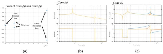 Poles and Bode plots of Conv1(s) and Conv2(s) with active resistance Rv1 = 75.62 Ω and different gains of resonant regulators. (a) Poles of Conv1(s) and Conv2(s), (b) Bode plot of Conv1(s), (c) Bode plot of Conv2(s) (blue: ki = ki1 = 40,837, red: ki = ki1 = 32,670, orange: ki = ki1 = 24,502).