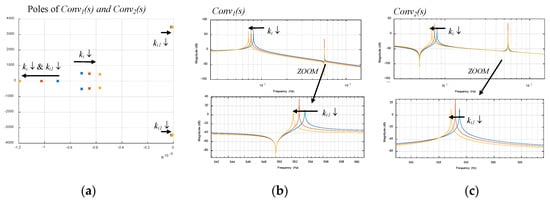 According to a different analysis, Figure 9 shows the behavior of the pole and Bode plots with active resistance Rv1 = 75.62 Ω and different gains of resonant regulators. Regarding the poles, it is seen that the poles corresponding to 50 Hz and 550 Hz move their real parts to the right with an integral gain decrease (opposingly, the move to the left with an integral gain increase). This means that a too-low gain could destabilize the system. It can be seen also that the real pole moves to the left with the gain decrease. In relation to the Bode plot of Conv1(s) (Figure 9b), it can be seen that at 50 Hz the gain is still 0 dB, while the bandwidth is reduced (peaks move left) with a lower ki gain. The same happens at 550 Hz. Finally, in relation to the Bode plot of Conv2(s) (Figure 9c), something equivalent occurs; the active admittance is kept constant (Rv1 = 75.62 Ω → −37.5 dB) while the bandwidth of the loops is reduced with lower integral gains.