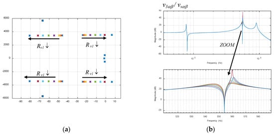 In this analysis, the variation of the active resistance is evaluated. From the initial value used in the previous analysis, specifically Rv1 = 7.562 kΩ (2.5 Ω at the low voltage side) programmed at 550 Hz (harmonic 11), several smaller active resistances are programmed (multiplied by factors: (1 0.75 0.5 0.25 0.15 0.1 0.075 0.05)). As can be observed in Figure 11a, the active resistance variation mainly affects the 550 Hz complex conjugate pole pairs, displacing them to the right and to the left with lower active resistance values. What it is very important here is to notice that the poles moving to the right can become unstable with very low values of active resistance. Alternatively, the rest of the poles are almost maintained unaltered. On the other hand, as can be observed in Figure 11b in the Bode diagrams, the active resistance decrease produces a higher attenuation at 550 Hz and the surrounding neighborhood, as expected. Therefore, through this analysis, the analytical global model reveals that it is important to choose an appropriate active resistance (not too small of a value) in order to make the system stable (as in an unstable situation, overcurrent or overvoltage protection would disconnect the converter).