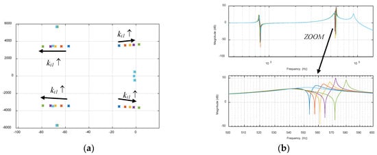 In this analysis, the variation of the current loop bandwidth of the active resistance is evaluated. With a constant Rv1 = 7.562 kΩ (2.5 Ω at the low voltage side) programmed at 550 Hz (harmonic 11), the gain of the integral part of the loop (ki1) is increased from its initial value (see Appendix A). As can be seen in Figure 12a, the variation again mainly affects the 550 Hz complex conjugate pole pairs, displacing them to the right and to the left with higher active resistance values, as well as possibly causing the system to become unstable with very high gains (high bandwidths). In the opposite direction, if ki1 is smaller, the systems would also become unstable due to a displacement to the right of the left hand-situated conjugate pole pair. On the other hand, as can be observed in the Bode diagrams of Figure 12b, this gain does not affect the attenuation achieved at a frequency of exactly 550 Hz. However, as expected, with a higher current loop bandwidth, the frequency range affected by the active resistance is bigger.
