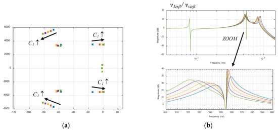 In this analysis, the effect produced by the variation of the equivalent impedances of the AC grid is evaluated. It emulates, for instance, the connection/disconnection of a significant group of wind turbines (and their corresponding subterranean capacitive cables) in the proximity of the Pcc, which is quite typical is some AC grids. From the initial value used for the grid impedances (see Appendix A), C1 is multiplied by factors (1 1.1 1.2 1.3 1.4), while the active resistance is kept constant at Rv1 = 1.51 kΩ (0.5 Ω at the low voltage side). In Figure 13a,b, it can be seen that C1 affects both 550 Hz and 900 Hz resonances of the AC grid, displacing them to the left as expected. However, since the active resistance remains constant at 550 Hz (note that the harmonics are expected to appear at multiples of 50 Hz), the system can become unstable, since the 550 Hz complex conjugate poles located nearer to the imaginary axes can cross to the positive plane. In fact, for this particular case analyzed, with multiplying factors of 1.3 and 1.4, the real part of the poles becomes unstable.