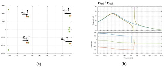 Dominant poles and Bode plots of the voltage at the Pcc with active resistance Rv1 = 7.562 kΩ (2.5 Ω at the low voltage side) programmed at 550 Hz. (a) Dominant poles of the system, (b) Bode plot of v3αβ(s)/vsαβ(s).