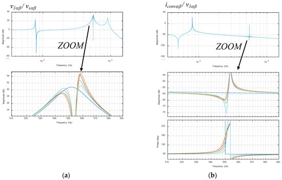On the other hand, as an example, Figure 4 shows the model Bode diagrams and poles of the studied AC grid not connected with the ACISEF (see Appendix A for numerical values of impedances). For this specific example, it is seen that at the grid voltage and currents (v3αβ, i3αβ) two big resonances appear, located at approximately 540 Hz and 900 Hz (Figure 4a,b). This means that these two specific voltage and currents, when at the source voltage (vsαβ), are polluted with small amplitude harmonics in the surroundings of the two resonant frequencies. Thus, there will be a big amplification in relation to the amplification that occurs at the grid’s 50 Hz frequency, potentially causing problems for the users connected to this grid. Note that the source voltage (vsαβ) represents the equivalent combination of voltage source converters (VSC), such as wind turbines of wind parks, loads, and many other elements that may emit small amount of voltage harmonics at or near these resonance frequencies, due to their intrinsic switching behavior.