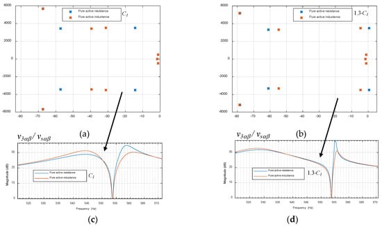 However, when a variation at the AC impedance occurs, for instance 1.3·C1, as in one of the examples from the previous sections, it was found that using a pure active negative inductance rather than a pure active resistance can provide more robustness to the system. This is a very interesting fact. Thus, as seen in Figure 16, when the impedance of the AC grid does not change but rather remains as expected, an active pure resistance or inductance of the same value (1.512 kΩ in both cases at 550 Hz) produces equal attenuation of the 550 Hz harmonic at the voltage at the Pcc. However, when the AC grid impedance changes (by, for example, a 30% increase in C1), while the pure active resistance does not guarantee stability, the pure active inductance ensures stability (poles with negative real parts). The active inductance also introduces a non-dominant pole with a high negative real part (not shown in Figure 16a,c for simplicity), but still presents good harmonic attenuation. Thus, with this particular and simple example, we seek to illustrate how in some AC grid scenarios, the combination of active resistances and active inductances can lead to a more robust global performance in reaction to uncertainties or variations of the AC grid impedances. Hence, with different AC grid scenarios with different natures of impedances, the combination of active resistances, inductances, or even capacitances could provide effective solutions. As such, we here emphasize that the analytical global model can be a suitable general tool to analyze these types of questions in an easy and quick way.
