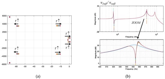Hence, the first study performed is the active impedance effect of the ACISEF, when it is connected to the AC grid used in previous sections (see Appendix A for data). The graphics shown mainly focus on the harmonic mitigation performance analysis; therefore, no Bode plots related to the 50 Hz loop are shown, although the loop is present. Hence, as can be seen in Figure 10a where the poles of all the transfer functions of the system are presented (the poles of all of the elements in MGAM(s) in Equation (21) are the same, what means that all the elements are present with the same denominator), the presence of an active resistance Rv1 = 7.562 kΩ (2.5 Ω at the low voltage side) programmed at 550 Hz (harmonic 11) makes two complex conjugate pole pairs appear around 550 Hz (3.4 krad/s). One pair is due to the presence of the AC grid equivalent impedance and the other pair is due to the loop. Then, there is one more complex conjugate pole pair mainly due to the second resonance of the AC grid at approximately 900 Hz (5.6 krad/s). In this example, there is no active resistance implemented. Then, there is one more complex conjugate pole pair mainly due to the presence of the 50 Hz loop (314 rad/s) of the ACISEF. Also, there is also one real pole located approximately at −1.7, which is due to the imbricated interaction of different parameters of the ACISEF. Finally, there is also a non-dominant pole at −12 × 105, due to the imbricated interaction of the parameters of the system that were left out of the graphic for simplicity in the exposition.