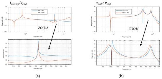 Bode plots with the ACISEF with L and LC output filters and active resistance (Rv1 = 1.51 kΩ programmed at 550 Hz). (a) Bode diagram of iconvαβ/v3αβ, (b) Bode diagram of v3αβ(s)/vsαβ(s).