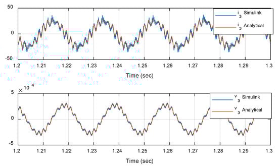 Thus, in Figure 22, two variables of both models are superposed: i3α and v3α. They operate with an active pure resistance of 10 Ω (at the low voltage side) to 550 Hz and an active resistance of 7 Ω (at the low voltage side) to 650 Hz. It can be seen that both variables match significantly well, even knowing the fact that at current i3α an important current ripple appears at the Simulink detailed model, while it does not appear in the analytical model because is not considered. It can be said that this good agreement between both models is also corroborated in the rest of the variables of the system and at different operating conditions. However, due to lack of space and in order to simply this exposition, these results are not shown in this article.