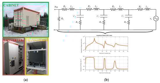 Experimental setup and equivalent impedance of AC grid (a) A picture of the converter, transformer, and location of the ACISEF, (b) estimated equivalent impedance of the AC grid at the point where the ACISEF is connected (Pcc) and adapted equivalent electric model (seventh order model approach).