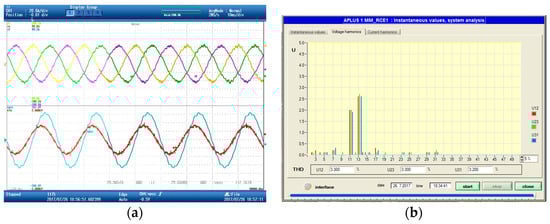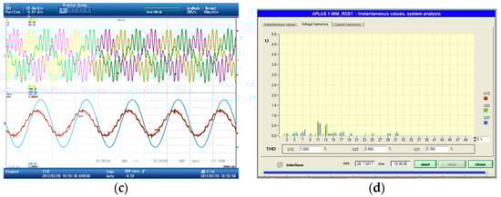 Thus, Figure 24a shows the current provided by the ACISEF operating as a reactive power compensator together with the voltage at the Pcc significantly polluted with the 11th (550 Hz) and 13th (650 Hz) voltage harmonics. In Figure 24b, it can be observed at the spectrum that the amplitude of the voltage harmonics at the 33 kV Pcc (approximately 2% and 2.5% for each harmonic, respectively). Then, in Figure 24c,d, the active impedance is enabled for the 11th and 13th harmonics (pure resistive 300 Ω at the higher voltage side for both harmonics), as described in the theoretical part of this paper. It is possible to see that the ACISEF provides the necessary converter current harmonics to significantly reduce the pollution of voltage harmonics (approximately 0.6% for both harmonics) and still be able to provide some remaining reactive current, for reactive current compensation at 50 Hz at the Pcc. It can also be observed that the THD of the voltage at each phase is improved considerably, i.e., phase a improves from 3.3% to 1%, phase b from 3.3% to 0.9%, and phase c from 3.2% to 0.7%.