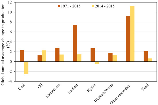 Global annual average change in energy production by fuel [1].
