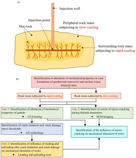 (a) Schematic diagram of a hot rock mass which undergoes cooling during fluid injection and (b) the flow of the experimental work covered by the study.
