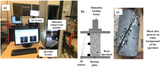 Uniaxial compressive strength (UCS) testing set-up (Shimadzu compression machine) with acoustic emission (AE) system and ARAMIS system (a), the sample instrumentation (b), and a tested rock specimen with paint spayed on the 3-D surface to detect the deformation by tracking co-ordinates (c).