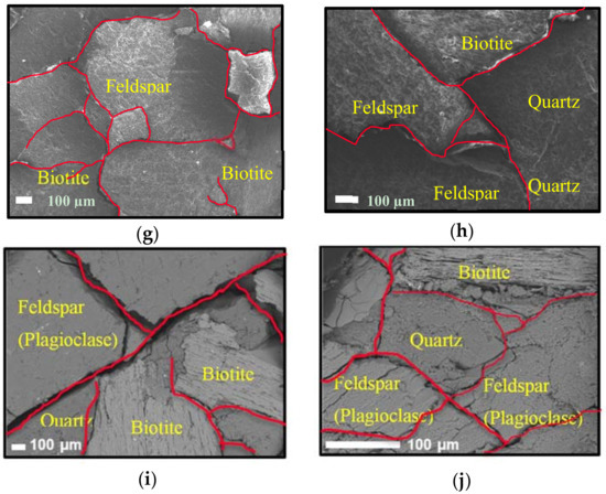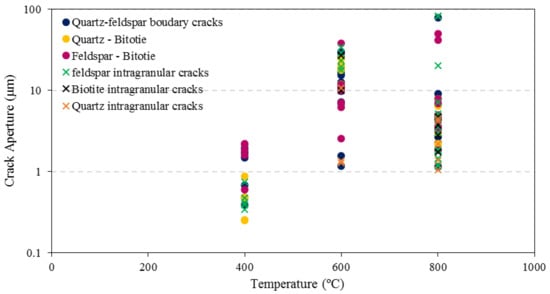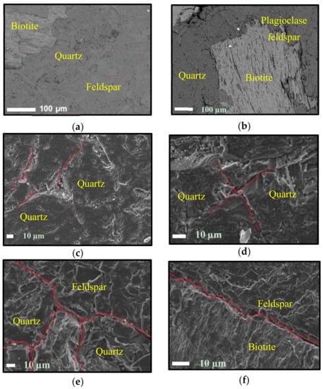 The granite specimens used for this study consisted of quartz, feldspar and biotite minerals. EDX analysis of these specimens showed that biotite grains are characterised by elongated shapes while quartz grains show sharply defined grain boundaries. At 400 °C, cracks along grain boundaries were observed and with further increase of temperature, the apertures of inter-granular cracks increased, and intra-granular cracks started to be induced. According to Gomez-Heras [40], this occurs first at triple junctions of grains since lower stress is needed to open up the boundaries due to high anisotropy. This is consistent with the present study (Figure 5e,g–i). At 600 °C, inter-granular cracks were observed in quartz and feldspar crystals while opening up of cleavages in biotite was also observed.