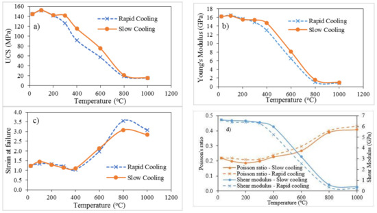 Strain values at failure are plotted in Figure 8c. As can be seen in the figure, failure strains at initial temperatures up to 400 °C are within the range of 1.1–1.3%, which shows brittle characteristics. However, with the increase of pre-heating temperatures beyond 400 °C, failure strains start to increase up to a range of 3.0–3.5%. This characterises the change of brittle behaviour to a quasi-brittle behaviour [44,45]. Importantly, the transition is achieved at a faster rate under rapid cooling than slow cooling. In addition, the shear modulus for each specimen was calculated using Young’s modulus values and Poisson’s ratios, and Figure 8d shows the variation of shear modulus. According to the results, considerably lower shear modulus can be seen in rapidly cooled specimens compared with slowly cooled specimens, and the divergence is negligible up to the pre-heated temperature of 400 °C. However, this difference is considerable for Harcourt granite specimens at pre-heated temperatures over 400 °C with the change of brittle behaviour more likely to ductile behaviour.