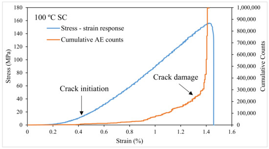 Stress-strain response accompanied by AE data for a specimen pre-heated up to 100 °C and subjected to slow cooling treatment.