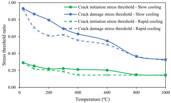 Change of crack initiation and crack damage thresholds over increase of pre-heating temperature under rapid cooling treatment and slow cooling treatment.