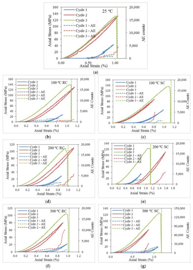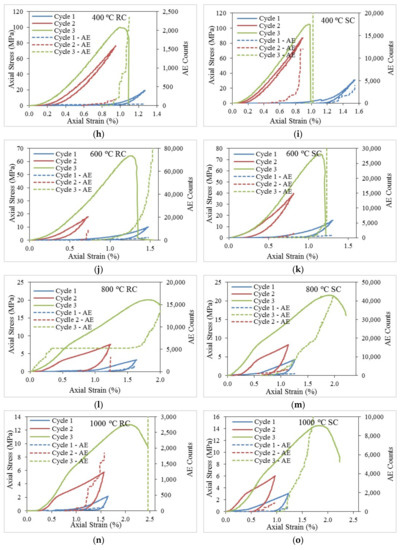 Stress-strain curves plotted with AE counts originated during loading and unloading cycles under each test condition, (a) 25 °C; (b) 100 °C RC; (c) 100 °C SC; (d) 200 °C RC; (e) 200 °C SC; (f) 300 °C RC; (g) 300 °C SC; (h) 400 °C RC; (i) 400 °C SC; (j) 600 °C RC; (k) 600 °C SC; (l) 800 °C RC; (m) 800 °C SC; (n) 1000 °C RC; (o) 1000 °C SC where RC denotes rapid cooling and SC denotes slow cooling.
