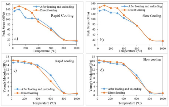 The elastic properties, including Young’s modulus, shear modulus, bulk modulus and Poisson’s ratio, of rock materials demonstrate the resistance of rock mass to deformation in terms of volume or shape. The Young’s modulus of Harcourt granite specimens was calculated considering the linear regions of the stress-strain curves. The Young’s modulus values over the increase of pre-heating temperature under both rapid and slow cooled conditions are illustrated in Figure 8b. According to the results, a slight increase of Young’s modulus was observed at 100 °C compared to room temperature under both cooling treatments (1.05% increase for slow cooling and 1.91% increase for rapid cooling). This further verifies that hardening of rock specimens occurs at this stage due to crack closure during thermal expansion. Moreover, the increase of Young’s modulus improves the rock’s compressive strength by bonding grains together, ultimately making a harder rock matrix.