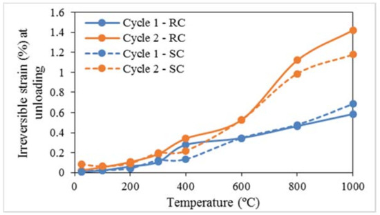 However, the above behaviour is insignificant with the increase of pre-heating temperatures over 600° under both rapid and slow cooling treatments, as shown in Figure 13 and Figure 14. Due to the initial thermal damage in rock specimens during heating followed by cooling treatments for pre-heating temperatures above 400 °C, a small load increment is sufficient to create coalescence and bridging of materials, which can be achieved even within the first cycle of loading. The observed higher plastic strains even during first cycle of loading further explain this. However, rearrangement of already formed cracks can happen during loading and unloading, which does not significantly affect the strength properties of rock specimens.