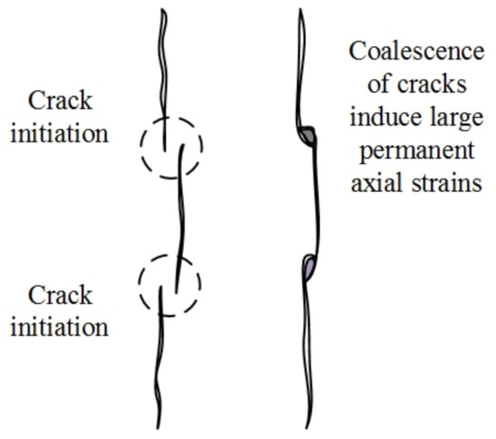 Reductions of UCS values and Young’s modulus values under initial pre-heating temperatures during loading and unloading occur due to the integrated stress-induced fracture damage in brittle materials in crystalline rock formations. When the applied load during the loading stage reaches the crack initiation threshold, the progressive development in cracks induces the extension of the micro-fracture network. However, the induced cracks do not seem to recover during the unloading stage and create irreversible deformations in the rock matrix. Moreover, multiple stages of loading and unloading prior to failure make the rock matrix weaker in strength properties through the continuous accumulation of fracture damage [24,47,48]. The irreversible strains resulting during loading cycle 1 and loading cycle 2 are plotted in Figure 13 for both cooling treatments. Loading up to crack initiation and unloading leaves small irreversible strains, initiating new cracks during the first cycle of loading. During the second cycle of loading, these initiated cracks reactivate and propagate until unloading. The coalescence of small individual cracks into larger cracks through bridging happens during loading cycle 2, and it increases the crack density and crack size, reducing material stiffness. Figure 14 illustrates the mechanism of coalescence which prevails during loading and unloading, where plastic strains are induced due to the collapse and weakening of the bridging material [49]. When this process continues with progressive accumulation in plastic strains during subsequent loading and unloading cycles, a decline in strength properties occurs in brittle materials.