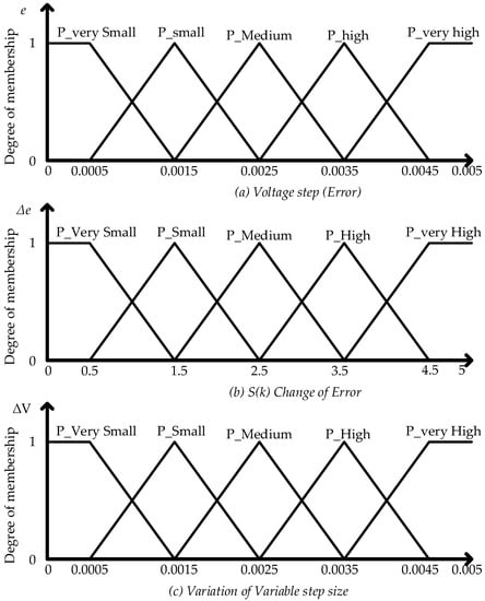 The membership function of the proposed fuzzy logic controller for the variable step size MPPT algorithm (a) fixed step size perturbation; (b) PV curve slope S(k); (c) variable step ∆Vpv(k).