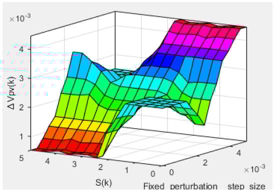 Mesh plot of the input and output mapping of the relationship between the fixed perturbation voltage step size and the measured PV curve slope S(k) and the output variable step ∆Vpv(k).